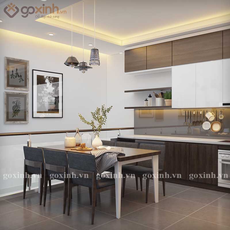 Như bạn biết các căn hộ chung cư hiện nay đều được thiết kế phòng ăn và phòng khách trong cùng một không gian nhằm tiết kiệm diện tích cho ngôi nhà. Khu vực bếp nấu sẽ được thiết kế phía sau lưng của phòng ăn đủ để một bàn chế biến thức ăn và bàn nấu , lựa chọn tủ bếp có nhiều ngăn được chia nhỏ thành ngăn đựng bát , ngăn để vật dụng làm bếp rất tiện lợi khi sử dụng ,ngăn nắp khoa học. Sử dụng một chiếc tủ lạnh dung tích lớn giúp bạn lưu trữ được nhiều đồ ăn hơn trong thời gian dài để bạn không tốn nhiều thời gian cho việc đi chợ.